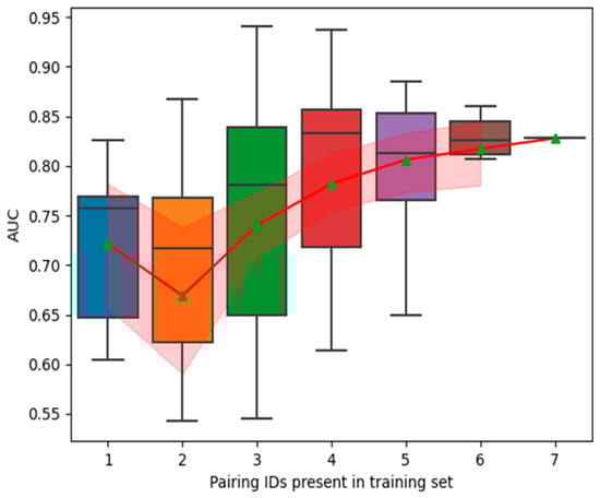The SML2 Learning Curve increased towards an AUC asymptote (AUC~0.85%) with the size of the training set pairings. The boxplot shows median (line), interquartile range (box range) and whole distribution (whiskers) without outliers. The line plot connects means (triangles). The 95% mean confidence interval of the line plot is shaded. We subsequently used this inverse power law learning curve framework to estimate clinical validation trial sample sizes required to achieve/exceed target product profile predictive performance.