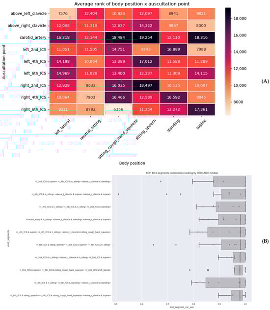 (A) Heatmap illustrating the informativeness of auscultation point-body position audible and inaudible vibroacoustic data segment types (the higher the value, the higher the importance of vibroacoustic segments, auscultation points and body positions). (B) Top ten 3-tuples of segments (of all possible 3-tuples) according to the median ROC AUC on session level. We considered all 3-tuples of segments; given 9 auscultation points and 6 body positions, and thus 54 segments, there are 24,804 such unique 3-tuples.
