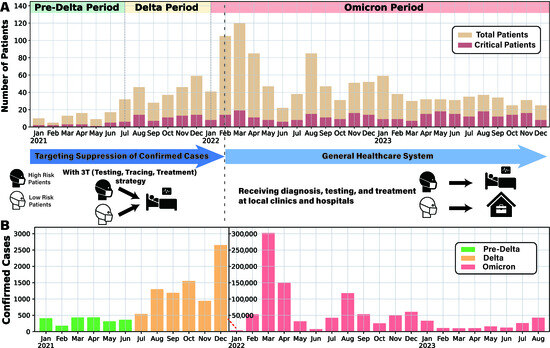 Overview of patient admissions and severity analysis at Chungbuk National University Hospital. (A) Monthly data of patients admitted from 2021 to 2023 are presented, with yellow-hued bar graphs indicating total patient counts and red-hued bar graphs representing critical cases. (B) Confirmed COVID-19 cases in Chungbuk regions from January 2021 to August 2023 are depicted. The graph was constructed using regional COVID-19 data from the Korea Disease Control and Prevention Agency, and because Korea transitioned from comprehensive to sample-based surveillance following the reclassification to a level 4 infectious disease on 31 August 2023, only data up to August 2023 were available for plotting. Due to the surge in cases during the Omicron period, the graph scale was adjusted mid-way, marked by a red dashed line and a new axis.