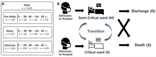 Data Summary and model diagram of patient state transitions. (A) Data summary: A total of 1483 patient records are included in the analysis. For each of the three epidemic periods (Pre-Delta, Delta, and Omicron), the number of patients is stratified by age group (0–39, 40–64, and 65+). Detailed counts are provided for each subgroup to support the model calibration. (B) The diagram illustrates the patient state transitions in the model. Patients are admitted in either a semi-critical or critical state, and transitions between these two wards are allowed during hospitalization. However, once a patient transitions to a death or discharge state, no further transitions occur.