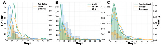 Histogram and KDE plots of total hospital length of stay by various grouping criteria. (A) Results by admission date, comparing the Pre-Delta, Delta, and Omicron periods. (B) Results by age group (0–39, 40–64, and 65+ years). (C) Results by clinical severity (semi-critical, critical, and deceased), with any patient who visited a critical care unit classified as critical.