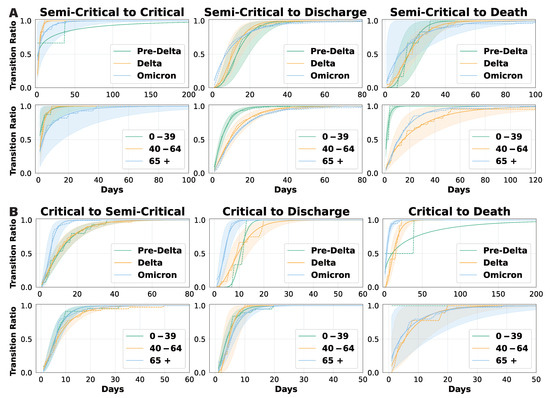 We conducted a gamma fitting analysis on ward length-of-stay data to derive cumulative daily transition functions (Figure 4). Each cumulative probability curve represents the conditional probability that a transition of interest occurs by a given day, conditional on that transition being the outcome for the patient. For example, the semi-critical-to-death curve indicates the probability that death occurs directly from the semi-critical ward within a specific number of days, assuming this is the terminal state reached. Since the cumulative probability reaches 1 when all patients have completed a transition, a lower curve indicates a longer transition duration. For transitions with sparse data, such as those from critical to death in the 0–39 age group, only the empirical data are displayed. In Figure 4A, the transition from the semi-critical to critical ward reveals a distinct pattern: patients during the Pre-Delta period experienced significantly longer transitions than those in later phases, and patients aged 65+ transitioned notably slower than those in the 0–39 and 40–64 age groups. In contrast, the cumulative probability curves for transitions from semi-critical care to discharge or death remained relatively consistent across epidemic phases, though younger patients (0–39) completed these transitions more quickly. In addition, the somewhat counterintuitive transition from semi-critical to death was observed in 136 patients, which is a larger number than initially expected. Among them, 112 were elderly, and the time to transition tended to increase with age. This finding suggests that direct deterioration from a semi-critical state without escalation to intensive care may reflect either clinical constraints or age-related differences in care pathways and prognosis.
