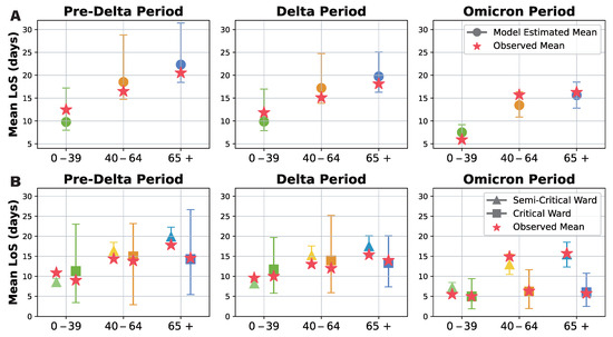Probabilistic transition model results for hospital length of stay analysis. Green, orange, and blue indicate results for ages 0–39, 40–64, and 65+. Circles, triangles, and squares show average stays overall, in semi critical wards, and in critical wards. Stars show actual data averages for comparison. (A) Overall hospital length of stay model estimates for each dominant variant period (Pre-Delta, Delta, Omicron) subdivided by age group (0–39, 40–64, 65+). Observed means marked with stars; model estimates with 95% confidence intervals marked with circles. (B) Mean durations in the semi-critical and critical wards for each dominant variant period subdivided by age group (0–39, 40–64, 65+). Semi-critical durations indicated by triangles; critical durations indicated by squares; observed means shown as stars; model estimates with 95% confidence intervals provided.