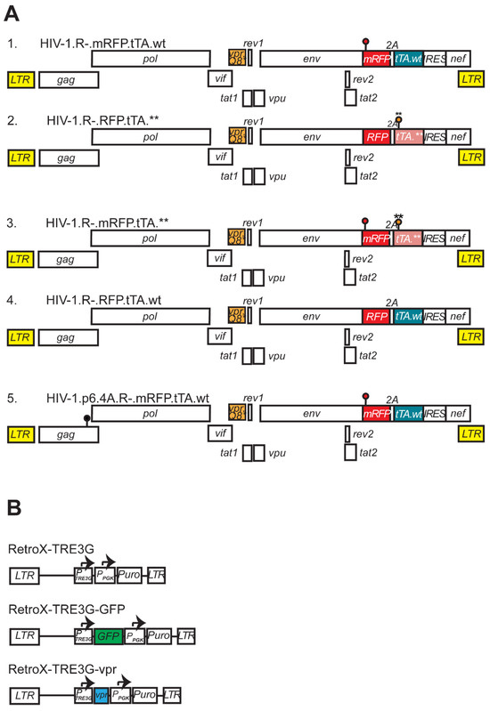 We constructed a pair of reporter viruses based on previously described HIV-1 NL4-3-derived vpr-defective viruses, which were used to demonstrate the positive effect of Vpr on HIV-1 replication in T cells using PRCA [30]. As shown in Figure 1(A1,A2), in both reporter constructs, the vpr gene was inactivated by replacing the glutamine (Q8) codon with a termination codon (Q8*). Both viruses encoded a tripartite polyprotein comprising red fluorescent protein (RFP or mRFP, an A2 self-cleaving peptide, and the tTA transactivator) [38,40]. The two constructs were isogenic except for (i) a cluster of silent mutations in the RFP gene (mRFP), and (ii) a cluster of premature stop codons in the tTA gene in one of the viral constructs (tTA.**). The wild-type and mutant RFP (mRFP) sequences provided unique tags, enabling selective detection and quantification of each virus in co-infection experiments via qPCR (Figure 1A in [30]).