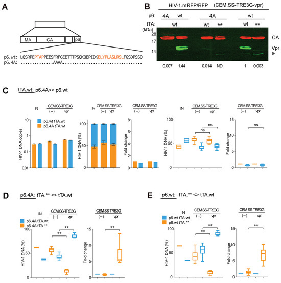 Virion-associated Vpr plays a minor role in enhancing HIV-1 replication. (A) Location of the 4A substitution in HIV-1 p6 amino acid sequence. The p6.4A sequence [39] is aligned with that of the HIV-1 NL43 p6 (p6.wt), in single letter code. Dots indicate identical amino acids. L-domain motifs are highlighted in orange. (B) p6.4A disrupts Vpr packaging into virions. CEM.SS-TRE3G-Vpr T cells were infected with the indicated HIV-1.R- reporter viruses in the presence of doxycycline. Supernatants collected 96 hpi which were processed for PAGE immunoblotting of CA and Vpr. tTA (tTA.wt, tTA.**) and p6 (p6.wt, p6.4A) genotypes of the viruses are noted. Positions of bands corresponding to CA and Vpr are indicated. Asterisk (*) marks a non-specific band cross-reactive with anti-Vpr antibody. Fluorescent signals were quantified with Odyssey Imager. Virion-associated Vpr levels, shown below the blot, were normalized to CA, then to a reference (p6.wt/tTA.wt) sample. The relative Vpr content of the virions, normalized to CA content and then to that in one of the HIV-1 with p6.wt and tTA.wt virus preparations, is shown below each lane. (*) indicates the position of a nonspecific band cross-reacting with the anti-Vpr antibody. (C) Impact of p6.4A on Vpr-mediated enhancement of replication. PRCA was performed using HIV-1 R- viruses with either p6.wt or p6.4A, both expressing tTA.wt. Experiments were performed and analyzed as described in the Figure 2C legend. Results from three independent experiments are compiled. Statistical significance (one-way ANOVA with post hoc Tukey test) is indicated above the C, D and E panels. **—p < 0.01, ns—not significant (D) PRCA with two p6.wt viruses: one expressing tTA.wt, the other tTA.**. Four independent replicates are compiled. (E) PRCA with two p6.4A viruses: one expressing tTA.wt, the other tTA.**. Four independent replicates are compiled.