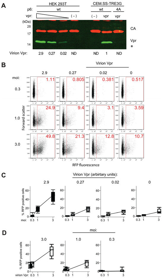 A panel of HIV-1 particles containing varying amounts of virion-associated Vpr was generated in HEK293T cells. These cells were co-transfected with the HIV-1.R-.RFP.tTA.wt proviral construct—bearing an inactivating Q8* mutation in the vpr gene and encoding RFP—and increasing amounts of a plasmid expressing wild-type HIV-1 Vpr. The resulting trans-complemented virions were concentrated and their lysates analyzed by immunoblotting for CA and Vpr. As shown in Figure 4A, Vpr levels in the virions spanned a more than 100-fold range, from undetectable to approximately three times higher than levels observed in virions produced from isogenic HIV-1 in CEM.SS-TRE3G-vpr T cells.