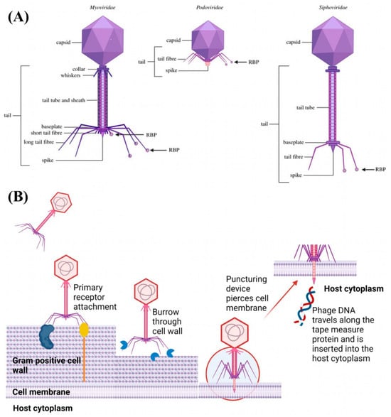 The morphological diversity of tailed bacteriophages and their infection process in bacterial hosts. (A) The three principal tailed phage morphotypes, classified by their tail structure: Myovirus with a contractile tail and complex baseplate with multiple fibers; Podovirus, distinguished by a short, non-contractile tail lacking a baseplate; and Siphovirus, which features a long, flexible, non-contractile tail. Receptor-binding proteins (RBPs) are located on tail fibers or spikes and are responsible for recognizing and attaching to specific bacterial surface receptors. Reprinted from [], Copyright © 2021 by the Authors and the Royal Society under the terms of the Creative Commons Attribution License (http://creativecommons.org/licenses/by/4.0/). (B) The generalized infection pathway of a tailed bacteriophage. The process begins with attachment to bacterial surface receptors via tail fibers, followed by penetration of the cell wall and membrane. The phage utilizes a puncturing mechanism to breach the host membrane, after which its DNA is translocated into the host cytoplasm, guided by structural components such as the tape measure protein. Reprinted from [], Copyright © 2024 by the authors and licensee MDPI, Basel, Switzerland, which is distributed under the terms and conditions of the Creative Commons Attribution (CC BY) license (https://creativecommons.org/licenses/by/4.0/).