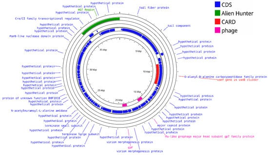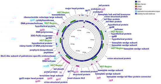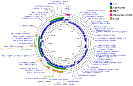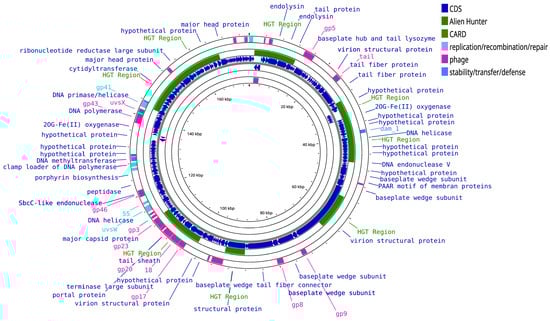 Some of the functional genes identified in marine phage genomes are associated with adhesion, invasion (csgG and fimB), immune evasion (clpP, clpB, and wcbK), antiphagocytosis (bplF, C, and L), and HGT. Many of these genes are found within genomic islands or adjacent to mobile genetic elements such as transposases and integrases, underscoring the role of phages in gene exchange within marine microbial communities [,,]. The genetic map of Vibrio phage pVa-6 (Figure 2) illustrates the modular genome organization, highlighting regions associated with immune invasion (e.g., Clp protease like protein), horizontal gene transfer (3 green regions), and integration (IntA). No antibiotic-resistant gene was predicted in Vibrio phage pVa-6.