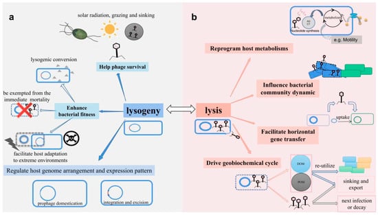 Ecological impacts of lysogenic–lytic transitions in marine phages. (a) The shift from the lytic to lysogenic cycle shields free phages from environmental hazards such as solar radiation, grazing by nanoflagellates, and removal via aggregation and sinking. Lysogeny increases host bacterial survival by providing immunity from immediate lysis and supports adaptation to extreme or fluctuating marine conditions. Moreover, lysogeny influences the host genome by integrating prophage DNA, with potential for excision and rearrangement. (b) Transitioning from lysogeny to lysis enables prophages to redirect host metabolism toward phage production, impacts microbial community composition through host cell lysis, promotes horizontal gene transfer, and fuels oceanic biogeochemical cycling via the release of cellular contents. Reprinted from [], Copyright © 2022 by the authors and licensee MDPI, Basel, Switzerland, which is distributed under the terms and conditions of the Creative Commons Attribution (CC BY) license (https://creativecommons.org/licenses/by/4.0/).
