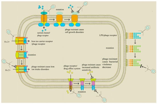 - Li, L.; Zhou, M.; Yu, M.; Ren, X.; Li, L.; Shen, C.; Deng, C.; Liu, Y.; Yang, B. Correlation between the development of phage resistance and the original antibiotic resistance of host bacteria under the co-exposure of antibiotic and bacteriophage. Environ. Res. 2024, 252, 118921. [Google Scholar] [CrossRef]