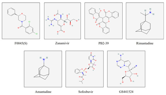 The 2D chemical structures of the tested compounds, sofosbuvir and GS441524, along with the standard inhibitors used in this study. These include F0045(S) (standard for HA protein), Zanamivir (standard for NA protein), PB2-39 (standard for the PB2 cap-binding domain), Rimantadine and Amantadine (standard for M2 protein).