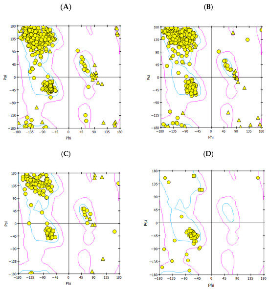 Results of the Ramachandran plot analysis of the predicted homology models of the H5N1 clade 2.2.4.4b proteins (A) HA, (B) NA, (C) PB2/CBD, and (D) M2.