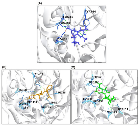Representation of the molecular interaction of ligands in the binding sites of the structure of the NA protein. (A) Zanamivir (standard) interacted through hydrogen bonds with NA residues TYR344, ARG368, ASP151, and SER367. (B) Sofosbuvir established hydrogen bonds with NA residues TYR344, ARG368, TYR402, ARG225, LYS432, ASP151, and GLU278. (C) GS441524 interacted through hydrogen bonds with ARG368, VAL149, ASP151, SER367, PRO431 (three hydrogen bonds), and LYS432 residues of the NA protein.