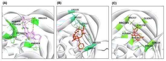 Results of the molecular interaction model of the tested compounds and the binding sites of the H5N1 clade 2.3.4.4b B2/CBD protein. (A) PB2-39 interacted through hydrogen bonds with only ARG355 and ASN429 residues of PB2/CBD. (B) Sofosbuvir interacted through hydrogen bonds with LYS339, LYS376, and HIS357. (C) GS441524 interacted through hydrogen bonds with ARG355, LYS376, PHE404, GLN406, GLU361, and SER324 residues in the binding site of the structure of the PB2/CBD protein.