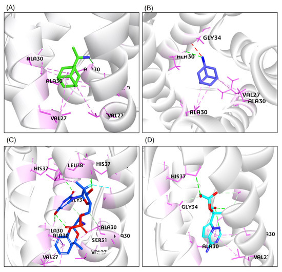 Results of the molecular interaction model of the tested compounds and the binding sites of the H5N1 clade 2.3.4.4b M2 tetrameric channel protein. (A) The Rimantadine (standard) interacted with the M2 protein residues of Chain-1 through hydrogen bonds: (AlA30; Chain 2: VAL27, ALA30; Chain 3: ALA30; Chain 4: VAL27, ALA30). (B) The Amantadine (standard) interacted with the M2 protein residues of Chain-2 through hydrogen bonds: (VAL27, ALA30); (Chain 3: ALA30); (Chain 4: ALA30, GLY34) amino acid residues of the M2 protein. (C) The sofosbuvir interacted through hydrogen bonds with M2-Chain 1: (VAL27, AlA30, GLY34, HIS37); Chain 2 through (ALA30, SER31, HIS37, LEU38); Chain 3 through (VAL27, ALA30, HIS37); and Chain 4 through (VAL27, ALA30, GLY34, HIS37) amino acid residues of the M2 protein. (D) The GS441524 compound interacted with hydrogen bonds with the M2-Chain 1: (AlA30, GLY34); Chain 2: (SER22, VAL27, ALA30); Chain 3: (ALA30, and HIS37) amino acid residues of the M2 channel protein.