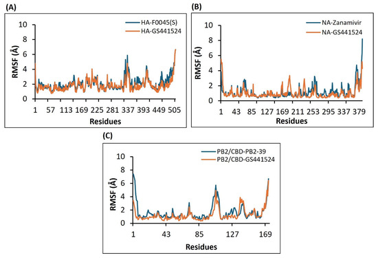 RMSF plots generated from the 50 ns MD simulation trajectories for the following protein–ligand complexes: (A) Model for HA in complex with F0045(S) (standard) or GS441524. (B) Model for NA in complex with Zanamivir (standard) or the GS441524 compound. (C) Model for the PB2/CBD complex with the PB2-39 (standard) or the GS441524 compound.