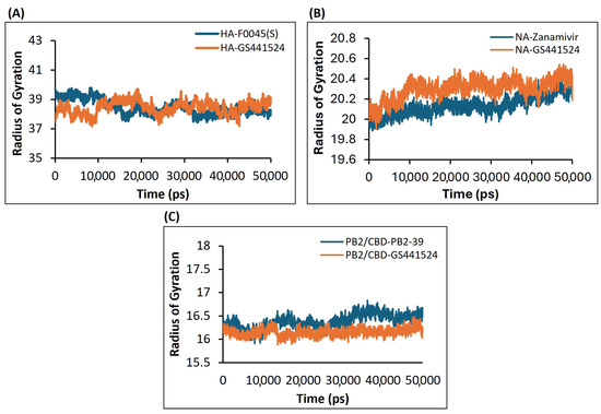 In the case of the NA protein, the average Radius of Gyration (Rg) values for the NA–Zanamivir and NA-GS441524 complexes were 20.1 Å and 20.2 Å, respectively (Figure 9B). These closely aligned values suggest that both complexes preserved structural integrity throughout the simulation, exhibiting only minor fluctuations. Similarly, for the PB2/CBD protein, the PB2/CBD-PB2-39 complex had an average Rg of approximately 16.4 Å, whereas the PB2/CBD-GS441524 complex showed a slightly lower average Rg of 16.2 Å (Figure 9C). The lower Rg value and minimal variation in the PB2/CBD-GS441524 complex indicate a more compact and structurally stable configuration compared to the reference. Overall, the Rg analysis supports that all protein–ligand complexes presented in this study maintained satisfactory compactness during the 50 ns simulation, with no significant conformational changes induced by ligand binding.