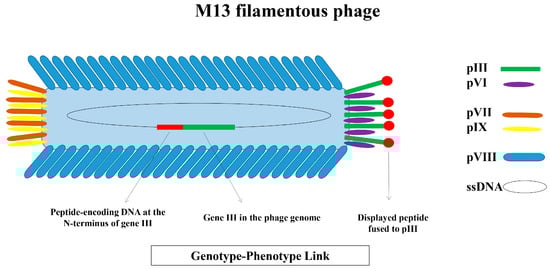 Bacteriophages, also known as phages, are viruses that specifically infect bacteria. Phage display was born in the mid-1980s, when George Smith introduced the concept that filamentous bacteriophage can serve as an expression vector capable of displaying antigens cloned into the phage genome on the virion surface [1]. He inserted foreign DNA fragments into gene III of the f1 phage and demonstrated that, as the phage assembles inside the host bacterium and is extruded from the cell, the foreign sequences are displayed on the phage surface as fusions to the pIII coat protein without disrupting the infectivity of the phage particle. The peptides encoded by the inserted sequences were in an accessible form and could directly interact with a target of interest. Since then, various phages, such as T4 [20], T7 [21], λ (lambda) [22], MS2 [23], and Qβ [24], have been used for display purposes. However, filamentous phages of the Ff family, including M13, fd, and f1, remain the most widely adopted platforms for the display of biomolecules, with M13 as the most predominant in the field [25,26]. The dominance of Ff bacteriophages over other phages for ligand display is attributed to their ability to achieve titers higher than those of other known phages, an efficient transformation that enables the generation of diverse libraries, and the robust stability of their virions under high temperatures, detergents, and extreme pH conditions. These properties collectively facilitate a broad range of biopanning conditions for the affinity selection of phage display libraries [26]. Additionally, these phages exhibit great genetic flexibility, making them well-suited for genetic engineering. This flexibility allows the enlargement of the genome size to be accompanied by a proportional increase in both the length of the phage particle and the number of pVIII molecules. As a result, the encapsulated DNA does not impose a limitation on the size of the phage particle [27]. These filamentous phages infect F plasmid-containing Gram-negative bacteria, like Escherichia coli, and follow a non-lytic life cycle. After the replication of the phage DNA, the translation of phage proteins, and the assembly of phage particles, new virions are released from infected bacteria without causing the lysis of the host cell. Although all five coat proteins of the M13 phage have been used for the surface presentation of foreign amino acids, pIII (one of the minor coat proteins with 406 residues) and pVIII (the major coat protein with 50 residues) are the most important coat proteins that have been broadly employed for peptide display [28]. The integration of the idea of combinatorial chemistry [29] with phage display led to the generation of phage display peptide libraries [2,3]. These combinatorial phage libraries house a large repertoire of peptide sequences that can be searched to identify ligands with desired binding characteristics. In phage display libraries, the physical linkage between the displayed peptide and the nucleotide sequence that encodes it, known as the genotype–phenotype link, is a foundational pillar of the technique that enables the sequence identification of displayed peptides with sought-after binding features [26,30]. Figure 1 illustrates the general structure of the M13 phage with its coat proteins and the physical linkage between the genotype and phenotype in phage display.