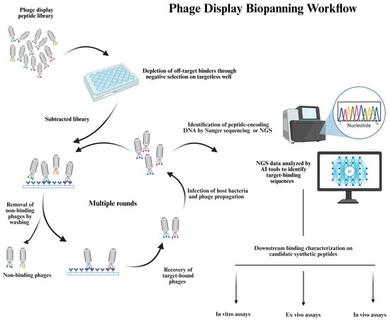A schematic overview of the phage display biopanning workflow and downstream validation. This figure illustrates the stepwise process of identifying target-specific peptides from a combinatorial phage display library. Initially, the library undergoes negative selection against a targetless solid support to remove phages that bind nonspecifically to the components of the selection system. The resulting subtracted library, depleted of off-target binders and obtained from the negative selection, is employed as input for the positive selection on the target of interest. After incubation, unbound or loosely bound phages are removed by stringent washing steps, and target-bound phages are eluted and then amplified in host bacterial cells to generate an enriched phage pool for subsequent rounds of selection. After multiple rounds of enrichment, the phage pool is subjected to DNA sequencing using either the Sanger approach or NGS. NGS offers a quantitative analysis of the peptide representation within the pool and enables data-driven interpretations using computational tools, such as artificial intelligence (AI) algorithms, to distinguish true binders from selection noise. One or more candidate peptides enriched in biopanning and identified through sequencing are chemically synthesized, and their target binding is investigated out of the phage scaffold through a stepwise workflow, starting with in vitro assays, proceeding to ex vivo analyses, and further advancing to in vivo testing in relevant animal models. This sequential validation ensures functional relevance and minimizes failures in subsequent validation phases, ultimately facilitating the discovery of target-selective peptide ligands.