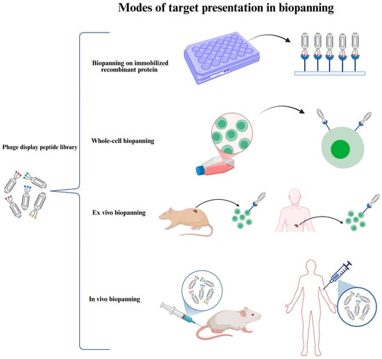 The choice of the target type is one of the most critical considerations in designing an effective biopanning strategy, as it directly influences peptide selection outcomes and the physiological relevance. The target employed in biopanning can be presented to the library in different modes (Figure 3). In this section, these modes are discussed critically, highlighting the advantages and disadvantages of each presentation format.