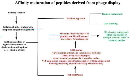 Various strategies are employed for the affinity maturation of phage display-derived peptides, which can be classified into two broad categories of the random approach and rational design (Figure 4). The random approach involves the unbiased exploration of the vast sequence space of peptides through stochastic methods and introduces diversity into peptide sequences without prior knowledge of the structure–function relationship. The random approach includes techniques such as random mutagenesis [146] and DNA shuffling [147,148]. In random mutagenesis, random mutations are introduced into the peptide sequence (e.g., by error-prone PCR), whereas in DNA shuffling, sequences from different peptide variants are recombined to generate a library of chimeric peptides that might contain variants with enhanced binding characteristics.