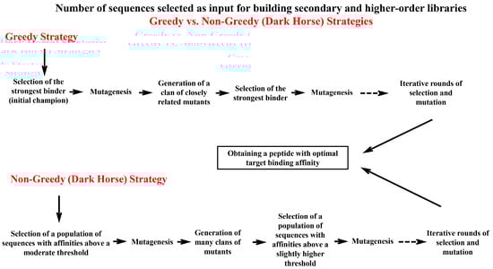Regarding the number of peptide sequences selected as the input for building secondary and higher-order libraries, two main strategies might be employed (Figure 5). The first one, which is known as the greedy strategy, involves selecting the best clone (the strongest binder), called the initial champion, and then subjecting this clone to either random or rational mutagenesis. This generates a clan of closely related variants. Again, the best binder from this clan is selected and mutagenized. This alternating process of selection and mutation is repeated until a peptide with optimal binding for the target is obtained. In this optimization program, each iteration selects “greedily” for the very best binder available within the population [162]. A significant limitation of this optimization scheme is that only close relatives of the initial champion are explored. Therefore, a minuscule region within the vast space of all possible sequences is searched to find the most fit sequence(s). However, it is entirely possible this localized search in the neighborhood of only the first-best sequence overlooks superior sequences that reside in distant, unexplored regions of the sequence space, including the neighborhoods of the second-best sequence, third-best sequence, fourth-best sequence, and so on. As a consequence, a more thoughtful alternative to the greedy plan is to relax the stringency of earlier selection round(s) to search in a broader part of the possible sequence space for finding more fit sequences. Based on this, rather than selecting the very best clone in the current population, a broader subpopulation of clones is selected that exhibits affinities above a certain moderate threshold. This baseline threshold is sufficiently permissive to retain “dark horses”, variants in the output of the primary selection that are (somewhat) inferior to the initial champion but possess the potential to be mutated and reach fitness levels even higher than the initial champion. In this non-greedy binding optimization strategy, a cocktail of sequences with diverse fitness levels (above the defined baseline level), containing thousands or millions of different variants, is selected and subjected to mutagenesis en masse, generating many clans of mutants. In the next round, a mixture of sequences with broad fitness levels (above a slightly higher threshold than the previous round) is selected from different clans of mutants. This process is repeated while increasing the selection stringency with each successive round. At the end of the final round, a stringent selection is employed to select the very best sequence in the existing population. By applying this scheme, dark horse sequences that reside in a different neighborhood than the initial champion can be discovered [162,163]. When sequences are similar and lie in the same neighborhood in the sequence space, they often converge on the same local optimum through mutational trajectories. However, the non-greedy strategy provides the opportunity to explore dark horse sequences from other neighborhoods of the sequence space, increasing the probability of finding the very best sequence that could exist in the possible sequence space. It is important to note that even by using the non-greedy strategy, it is not possible to explore the entire sequence space, and there is always the chance that a significantly better binder exists somewhere in the vast expanse of the sequence space. However, considering the impracticality of conducting a truly global search, the close neighborhoods of the best binder in the sequence space remain the most promising areas to become the focus of ligand optimization efforts [162]. Figure 5 illustrates a schematic comparison of the greedy and non-greedy strategies for optimizing the binding affinity of phage display-derived peptides.