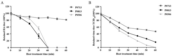 Based on the result of phylogenetic analyses, our strain P0506 and the previously isolated strains pi/CH/LHLJ/110813 (P0813) in sub-genotype VI.2.1.1.2.1 and pi/CH/LLN/110713 (P0713) in sub-genotype VI.2.1.1.2.2 [30] were selected for further study. Thermostability of NDVs was determined as previously described [23,27]. Briefly, aliquots of virus-infected allantoic fluids were incubated in a water bath at 56 °C, triplicate samples of each virus were collected and then transferred to ice to stop the heat inactivation at 10 min intervals until 60 min after incubation. The HA activities and infectivity of heat-treated viruses were evaluated by HA assay and 50% tissue culture infectious dose (TCID50) assay in DF-1 cells as previously described [36].