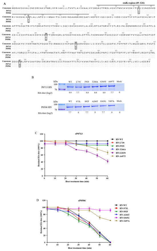 According to the results of the thermostability test, P0713 and P0506, belonging to sub-genotype VI.2.1.1.2.2, demonstrated distinct resistance to heat treatment. Since HN protein is considered the key determinant of NDV thermostability [27], the amino acid sequences of HN protein from P0713 and P0506 were compared. Multiple amino acid substitutions that were distributed across the whole HN protein, including the stalk region (49–126 aa) and globular head domain (127–571 aa), were found between the two viruses. Specifically, five amino acid substitutions at positions 73, 92, 266, 365, and 497 were found in HN proteins between P0713 and P0506 (Figure 4A).