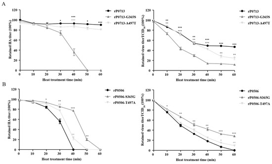 Effects of amino acid residues at positions 365 and 497 in HN protein on thermostability of virus. (A) Results of the thermostability test of rP0713, rP0713-G365S, -A497T. (B) Results of the thermostability test of rP0506, rP0506-S365G, -T497A. Allantoic fluids of each virus were treated at 56 °C for 60 min. The HA activity and TCID50 of each virus were determined at 10 min intervals. Means and standard deviations (SD) are shown for three independent experiments. The retained HA or virus titers among different viruses were analyzed with one-way analysis of variance (*, p < 0.05; **, p < 0.01; ***, p < 0.001).