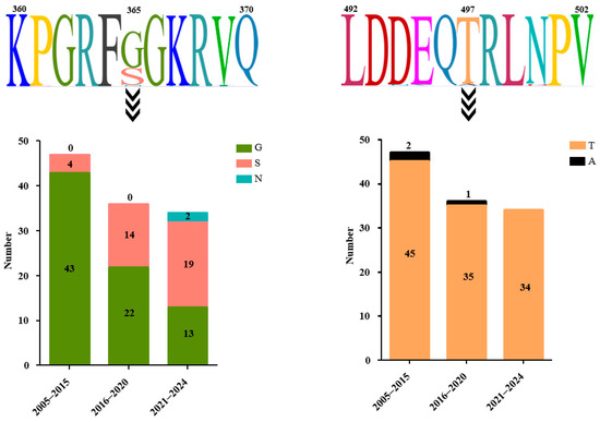 To investigate whether the dynamic substitution of residues 365 and 497 in HN protein occurred during the transmission of sub-genotype VI.2.1.1.2.2 NDV, the amino acid sequences of the HN proteins from viruses isolated from different time periods were compared (Figure 6). For residue 365, 43 isolates (91.49%) had G and 4 isolates (8.51%) had S in viruses isolated between 2005 and 2015, 22 isolates (61.11%) had G and 14 isolates (38.89%) had S between 2016 and 2020, and 13 isolates (38.24%) had G, 19 isolates (55.88%) had S, and 2 isolates (5.88%) had N between 2021 and 2024. For residue 497, 45 isolates (95.74%) had T and 2 isolates (4.26%) had A in viruses isolated between 2005 and 2015, 35 isolates (97.22%) had T and 1 isolate (2.78%) had A between 2016 and 2020, and all 34 isolates had T (100%) between 2021 and 2024. These results indicated that residue 497 was conserved in HN protein from sub-genotype VI.2.1.1.2.2 NDV, while residue 365 presented high diversity with time.