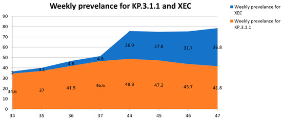Weekly global prevalence of SARS-CoV-2 variants XEC and KP.3.1.1 from Epiweek 34 to Epiweek 47 of 2024. Stacked area chart displaying the relative weekly proportions of GISAID-submitted sequences identified as XEC (blue) and KP.3.1.1 (red) at eight surveillance time points. Data were derived from the WHO variant tracking summaries using GISAID aggregate reports between 19 August and 7 December 2024. XEC prevalence rose steadily from 2.0% in Epiweek 34 to 36.8% by Epiweek 47, while KP.3.1.1 initially increased to 48.8% in Epiweek 44 before gradually declining to 41.8%. Data was generated from [17,33,38,39].