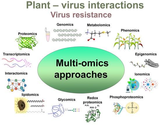 In addition to the omics strategies discussed above, an increasing number of studies also incorporate relatively newer omics approaches including epigenomics, interactomics, lipidomics, ionomics, microbiomics, glycomics, redox proteomics, and phosphoproteomics (Figure 1) [] which would open up new opportunities in analysis of plant–virus interactions. Furthermore, other omics complementary to genomics are emerging, such as phenomics with its emphasis on high-throughput phenotyping using imaging technologies to correlate phenotypic changes with molecular data []. With a prime focus on the “four big omics”—genomics, transcriptomics, proteomics, metabolomics—we will outline their links with other omic technologies, in particular, with regard to future plant virus research. This review will mainly contemplate RNA virus–plant interactions particularly providing some examples from our own research carried out on plants of the family Solanaceae. This family is considered one of the most important families among plants because it includes many staple food crops and species rich in essential secondary metabolites []. However, omics technologies have also been successfully applied to many other crops and species which is illustrated in Table 1. Moreover, information in this table is not restricted by RNA viruses and includes various DNA viruses, which, however, may require a modified analytic strategy especially in the genomic and transcriptomic platforms.
