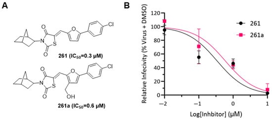 Determining IC50 for compounds 261 and 261a. (A) Structure of 261 and 261a with corresponding IC50 data; note the difference is the incorporation of a hydroxyl substitution on the furan ring. (B) SARS-CoV-2 entry inhibition assay was performed using a monolayer of VeroE6 cells. For compound 261 (black circles), the IC50 value was found to be 0.3 µM and the IC50 value for 261a (pink squares) was 0.6 µM. The measurements were carried out in triplets and error bars are included in the graph.