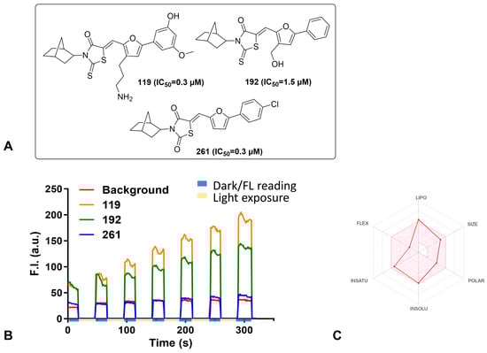 Chemical characterization of selected inhibitors. (A) Chemical structure of the inhibitors tested in the thiol reactivity and photosensitivity assays along with their IC50 concentration. (B) Singlet Oxygen Sensor kit. Selected compounds were exposed to light for 20 seconds (beige blocks on time axis), and then the fluorescence was measured for 30 seconds in the dark (blue blocks on time axis) for a total of 6 rounds. The fluorescent intensities were plotted as the area under the curve for each inhibitor; 119 (orange) and 192 (green) show increasing fluorescence intensity as time and light exposure progressed. In comparison, 261 (blue) did not exhibit increased fluorescence over time and instead fluorescence intensity remained similar to background readings (red) for the duration of the experiment. (C) The bioavailability radar plot for compound 261 (red line) as calculated by SwissADME. The area in pink is considered to have properties that are of a drug-like nature.
