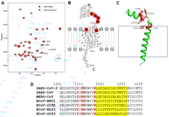 Using NMR, the structure of the TMD (amino acids 1209–1236) of the S-protein was determined to form trimers []. Our construct encompassed the TMD and the upstream juxtamembrane aromatic region (S-TMD, amino acids 1201–1239). Structural studies using this constructed in detergent micelles revealed that S-TMD peptide consists of two helices: one helix extending into the virion’s membrane and the other extended into the external space, separated by a proline break []. A structural model of 261 bound to S-TMD was generated based on dihedral angle restraints determined in micelles. However, the relative orientation of the helices could not be resolved due to the absence of long-range restraints. To investigate the interaction of 261, the S-TMD was reconstituted in bicelles composed of dihexanoylphosphatidylcholine (DHPC) and 1,2-dimyristoyl-sn-glycero-3-phosphocholine (DMPC), which better mimic the membrane environment. The spectra of S-TMD in bicelles were similar to those in DPC micelles. To probe molecular interactions, 1H-15N-HSQC spectra of S-TMD were collected in the presence of DMSO and compound 261 (Figure 3A). Upon addition of compound 261, residues Y1209, I1210, K1211, and W1212 showed chemical shift perturbations, while I1216 and W1217 exhibited line broadening. These results suggest direct molecular interactions between S-TMD and 261. The location of these residues in relation to the S-TMD is highlighted in a red cartoon representation (Figure 3B) and ribbon model (Figure 3C). I1216 and W1217 are located just in the lipid membrane, while residues Y1209, I1210, K1211, and W1212 are located in a flexible region in between two α-helices. This region is highly conserved across human coronaviruses (Figure 3D).