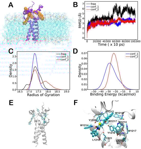 Two trimeric models of SARS-CoV-2 spike transmembrane domain (TMDTri) were constructed, the first model using the AlphaFold 3.0 server [] and the second using the SWISS-MODEL server [] in conjunction with NMR data. A sequence of 40 residues (sequence: MQELGKYEQYIKWPWYIWLGFIAGLIAIVMVTIMLSSMTS) was used for each monomer. A total of eleven membrane-bound systems of TMDTri were prepared using the Membrane Builder Module of CHARMM-GUI [,]: one without ligands, and ten with ligands in different orientations and at different positions of TMDtri models. Dimyristoylphosphocholine (DMPC) lipids were used to construct the lipid-bilayer. Each ligand-bound system contains three ligands in the same orientation. In conf-1, the furan’s oxygen atom is oriented toward the protein, while in conf-2, it is directed toward the lipid bilayer. During the construction of the simulation box at pH 7.0, water molecules were added with a thickness of 40 Å from protein/bilayer along the Z-axis. The final simulation box dimensions were 86 Å × 86 Å × 131 Å. The ligand-free system contains 204 DMPC lipid molecules and 20,561 water molecules, while the ligand-bound system has 203 DMPC lipid molecules and 20,474 water molecules. These systems were neutralized with sodium and chloride ions and used for molecular dynamics (MD) simulations [].