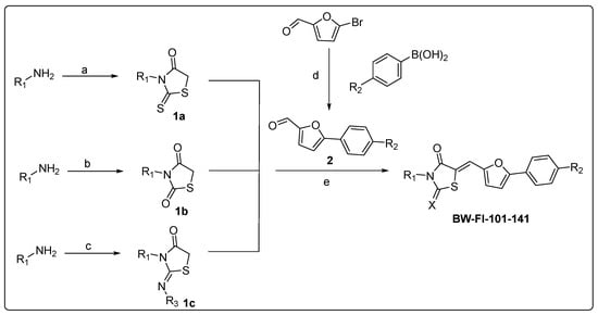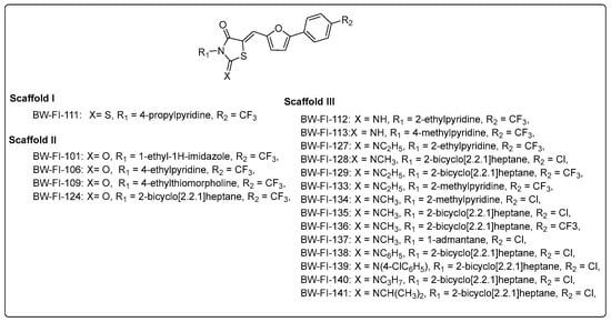To explore possible improvements to inhibition, a number of analogs were synthesized. The new compounds (BW-FI-101-141) were synthesized, as shown in Scheme 1 and Scheme 2. The first step involved the five-membered ring (1a, 1b, and 1c) formation using different procedures (see Supporting Information). Substituted furan aldehyde (2) was synthesized by the Suzuki coupling reaction and reacted with compounds 1a, 1b, and 1c to obtain final compounds (BW-FI-101-141), respectively. The yield of the final compounds was between 52 and 93%.