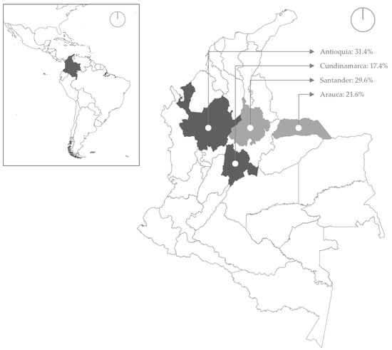 The epidemiology of EIV is not completely understood because EIV transmission and outbreaks are associated with horse movement [2], a lack of vaccination [10], outdated vaccines [18], and antigenic drift [28,29]. In Latin America, studying the distribution of EIV antibodies allows for the understanding of geographical exposure over time and the assessment of exposure within a population. Furthermore, serological investigations of EIVs provide a means to assess risk factors for susceptible populations in specific areas and then design better health interventions to minimize the impact of EIVs on equine health and performance. Our aim was to perform a sero-epidemiological survey of equine influenza infections and to identify associated risk factors in horses from four departments of Colombia.
