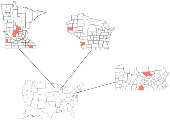 Counties where study farms were located and each state’s relative location in the United States. We name the graphics from the top left clockwise. Minnesota Counties (top left): Fillmore, Kandiyohi, Lincoln, Morrison, Scott, Stearns. Wisconsin Counties (top right): Crawford, St Croix. Pennsylvania Counties (bottom): Franklin, Lycoming. Lines connect each state to its approximate location on the U.S. map to illustrate geographic context.