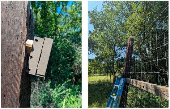 Image of camera placed on fence post displaying camera angle relative to the fence post (left). Cameras were placed between 10 and 20 degrees relative to the fence post. Image of camera displaying its view along the fence (right).
