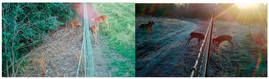 Images where deer were within one body length of one another. An image labeled as “contact possible” (left) with wild deer on the left-hand side of the image and farmed deer on the right-hand side. The second image (right) was classified as “contact observed”; the wild deer (right) is pictured sparring with a farmed deer (lef2.5.2. Megadetector).