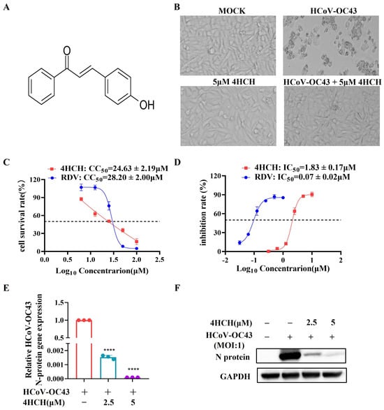 4HCH inhibits HCoV-OC43 replication in vitro. (A) Chemical structure of 4-hydroxychalcone (4HCH). (B) Representative images of RD cells at 3 days post-infection (dpi) in control group, 5 µM 4HCH-treated group, HCoV-OC43-infected group, and HCoV-OC43-infected group treated with 5 µM 4HCH. (C) Cytotoxicity (CC50) of 4HCH and remdesivir (RDV) against HCoV-OC43 in RD cells, determined using AlamarBlue assay. (D) Antiviral activity (IC50) of RDV and 4HCH against HCoV-OC43 in RD cells, determined using AlamarBlue assay. (E,F) Viral nucleocapsid (N) mRNA and protein levels in HCoV-OC43-infected RD cells treated with 4HCH for 48 h, assessed by RT-qPCR and Western blot, respectively. β-Actin and GAPDH served as internal controls. Data are presented as mean ± SD. All experiments were repeated independently three times. Student’s t-test was used to assess statistical significance of differences between untreated and 4HCH-treated groups. **** p < 0.0001 vs. HCoV-OC43-infected group.