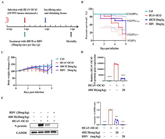 All animal experiments were approved by the Animal Care and Use Committee of Rongwan Biological Laboratory Animal Center (Shenzhen, China) and conducted in accordance with institutional guidelines. Specific pathogen-free (SPF) C57BL/6 suckling mice (4–6 g, 10 days old, sex undetermined) were obtained from Guangdong Zhuhai Baishitong Biotechnology Co., Ltd. (Zhuhai, China), and were randomly divided into four groups (n = 12 per group): control (Ctrl), infection (HCoV-OC43), 4HCH treatment (HCoV-OC43 + 4HCH), and RDV treatment (HCoV-OC43 + 4HCH). Mice were intranasally infected with 106 PFU of HCoV-OC43 and treated intraperitoneally with 4HCH (20 mg/kg) or RDV (20 mg/kg) once daily for 9 consecutive days. Control groups received placebo: 2% DMSO (Amresco, Darmstadt, Germany), 5% Tween-80 (Solarbio, Beijing, China), 40% PEG-300 (MCE, Shanghai, China), and 53% saline (Kelun, Chengdu, China). Survival rates and body weights were monitored daily. On day 4 post-infection, brain tissues were collected to assess viral load and viral N protein expression. This was accomplished using RT-qPCR and Western blot analysis, respectively.