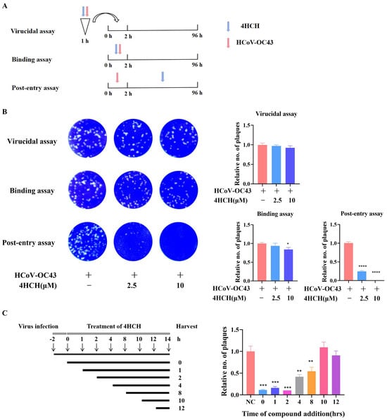 4HCH targets the post-entry phase of HCoV-OC43 infection. (A,B) Experimental setup to determine if 4HCH directly inactivates virus particles or blocks viral attachment. RD cells were treated with 4HCH under three conditions: pre-treatment (4HCH + virus pre-incubation for 1 h), co-treatment (4HCH + virus co-incubation for 2 h), and post-treatment (4HCH added after viral infection). Plaque formation was assessed after 4 days. (C) Time-of-addition analysis. RD cells were infected with HCoV-OC43, and 4HCH was added at 0, 1, 2, 4, 8, 10, and 12 h post-infection. Viral titers in the supernatant were determined by plaque assay. Data are presented as mean ± SD. A Student’s t-test was used to assess the statistical significance of differences between untreated and 4HCH-treated groups. * p < 0.05, ** p < 0.01, *** p < 0.001, **** p < 0.0001 vs. HCoV-OC43-infected group. All experiments were repeated three times independently.