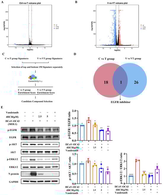 4HCH inhibits the EGFR/AKT/ERK1/2 signaling pathway. (A,B) Volcano plots showing differentially expressed genes (DEGs) in RD cells treated with 4HCH under normal (C vs. T) and HCoV-OC43-infected (V vs. VT) conditions. DEGs were selected based on adjusted p < 0.05 and fold change > 2. (C) Schematic of the Connectivity Map (cMAP) analysis to identify compounds with mechanisms of action similar to 4HCH. (D) Functional overlap analysis of cMAP-identified compounds, highlighting EGFR inhibitors. (E) Western blot analysis of EGFR, phosphorylated EGFR (p-EGFR), AKT, phosphorylated AKT (p-AKT), ERK1/2, and phosphorylated ERK1/2 (p-ERK1/2) in HCoV-OC43-infected RD cells treated with 4HCH or the EGFR inhibitor Vandetanib for 24 h. GAPDH served as an internal control. Data are presented as mean ± standard deviation (SD). Statistical significance is indicated as * p < 0.05, ** p < 0.01, *** p < 0.001, and **** p < 0.0001 compared to the untreated HCoV-OC43-infected group. All experiments were independently performed in triplicate. A Student’s t-test was used to evaluate statistical significance between the untreated HCoV-OC43-infected group and the 4HCH- or Vandetanib-treated groups.