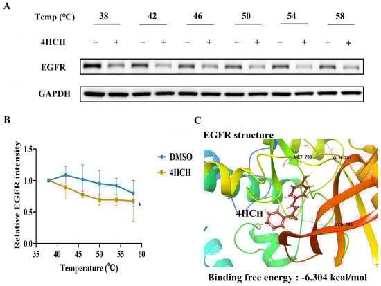 4HCH likely interacts with EGFR. (A,B) Cellular thermal shift assay (CETSA) showing the thermal stabilization of EGFR in HCoV-OC43-infected RD cells treated with 4HCH. GAPDH served as a control. (C) Molecular docking analysis of 4HCH binding to EGFR, with key residues MET793, GLN791, and LYS745 forming hydrogen bonds. The binding energy of 4HCH to EGFR is −6.304 kcal/mol. Data are presented as mean ± standard deviation (SD). Statistical significance is indicated as * p < 0.05 compared to the DMSO control group. A Student’s t-test was used to evaluate statistical significance between the DMSO control group and the 4HCH-treated group.