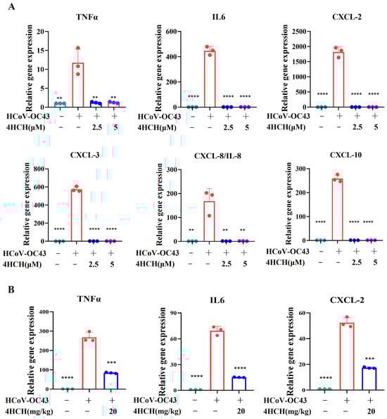 4HCH suppresses pro-inflammatory cytokine and chemokine expression in HCoV-OC43-infected cells. (A) RT-qPCR analysis of mRNA levels of TNFα, IL-6, CXCL-2, CXCL-3, CXCL-8/IL-8, and CXCL-10 in RD cells infected with HCoV-OC43 and treated with 4HCH (2.5 µM and 5 µM). (B) RT-qPCR analysis of mRNA levels of TNFα, IL-6, and CXCL-2 in the brain tissues of suckling mice infected with HCoV-OC43 and treated with 4HCH (20 mg/kg). Data are presented as mean ± SD. A Student’s t-test was used to assess the statistical significance of differences between untreated and 4HCH-treated groups. ** p < 0.01, *** p < 0.001, **** p < 0.0001 vs. HCoV-OC43-infected group. All experiments were repeated three times independently.
