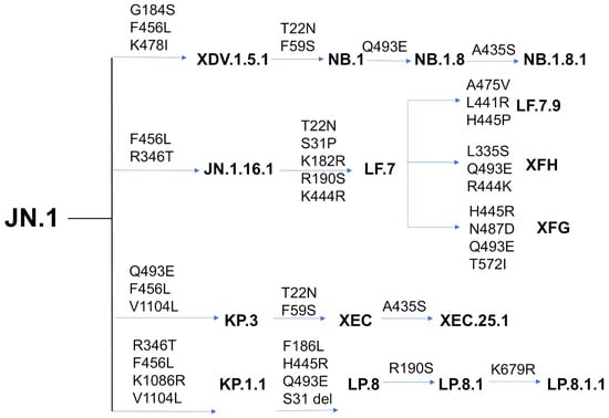 Phylogenetic Evolution of SARS-CoV-2 Variants Derived from JN.1 Lineage. Evolutionary trajectory of SARS-CoV-2 variants originating from the JN.1 lineage, highlighting key mutations that define distinct sublineages. The tree depicts the emergence of major variants such as XDV.1.5.1, NB.1.8, LF.7, KP.3, and their respective descendants, including NB.1.8.1, XFH, XFG, XEC.25.1. Key amino acid substitutions are annotated along each branch, indicating the genetic changes that drive variant divergence.
