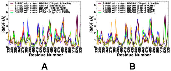 To summarize, the results highlighted subtle but important distinctions in the dynamic signatures of the RBD induced by class I antibodies. The observed dynamic modulation of the RBD by class I antibodies reflects a spectrum of binding strategies—from rigidification and global stabilization (BD55-1205) to localized flexibility and intermediate rigidity (P5S-1H1 and P5S-2B10), and to a more flexible and adaptable interface (BD-604) that is functionally effective but may be compromised in latest Omicron subvariants. These findings underscore that neutralization mechanisms are shaped not only by static epitope mapping and direct interaction contacts, but also by how each antibody modulates and reshapes the RBD conformational landscape, influencing its structural plasticity and mutational tolerance.