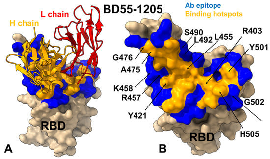 Structural mapping of BD55-1205 interactions with binding hotspots and backbone-contacting RBD residues. (A) Structure of BD55-1205 bound to the RBD (PDB ID: 8XE9). The heavy chain is shown in orange ribbons, light chain in red. The binding epitope on the RBD is displayed in blue surface, with binding hotspot residues in orange. (B) Close-up view of the interface showing how these backbone-interacting residues contribute to the overall binding architecture. The binding epitope residues involved in backbone-mediated contacts, including L455, R457, K458, A475, G476, S490, L492, and G502, are annotated.